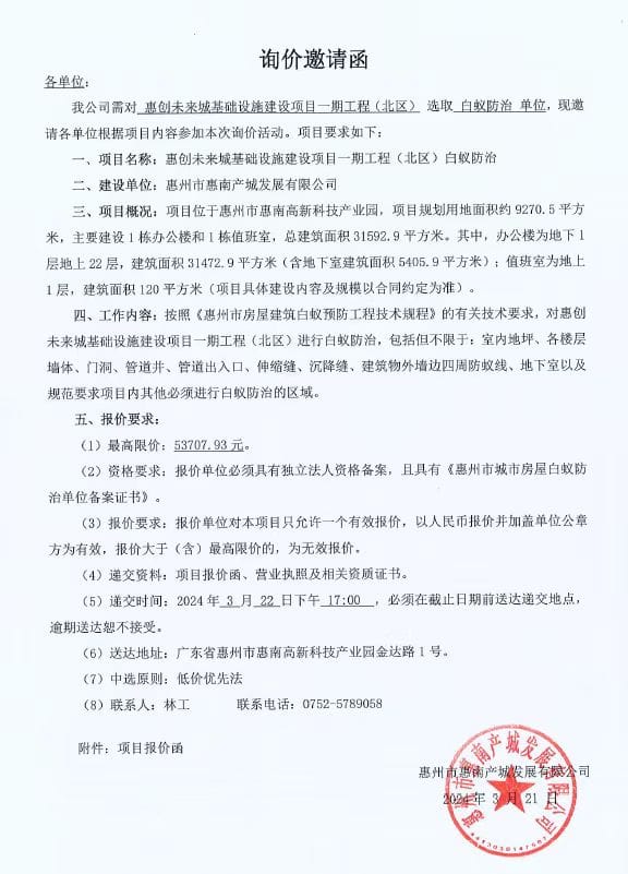 惠創(chuàng)未來城基礎(chǔ)設(shè)施建設(shè)項目一期工程(北區(qū))白蟻防治詢價邀請函