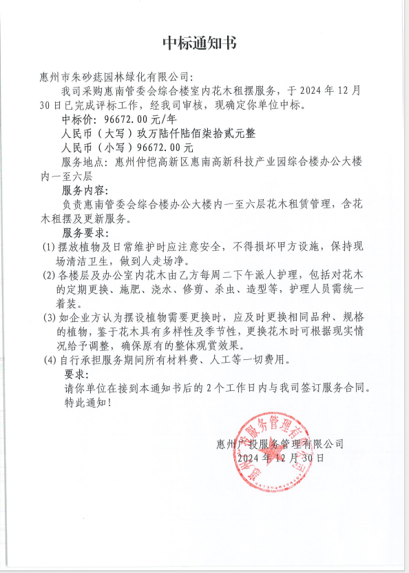 【中標(biāo)通知】采購惠南管委會(huì)綜合樓室內(nèi)花木租擺服務(wù)