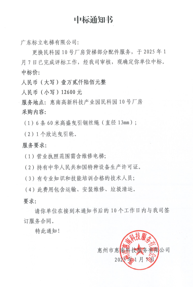 【中標(biāo)通知】更換民科園10號(hào)廠房貨梯部分配件服務(wù)