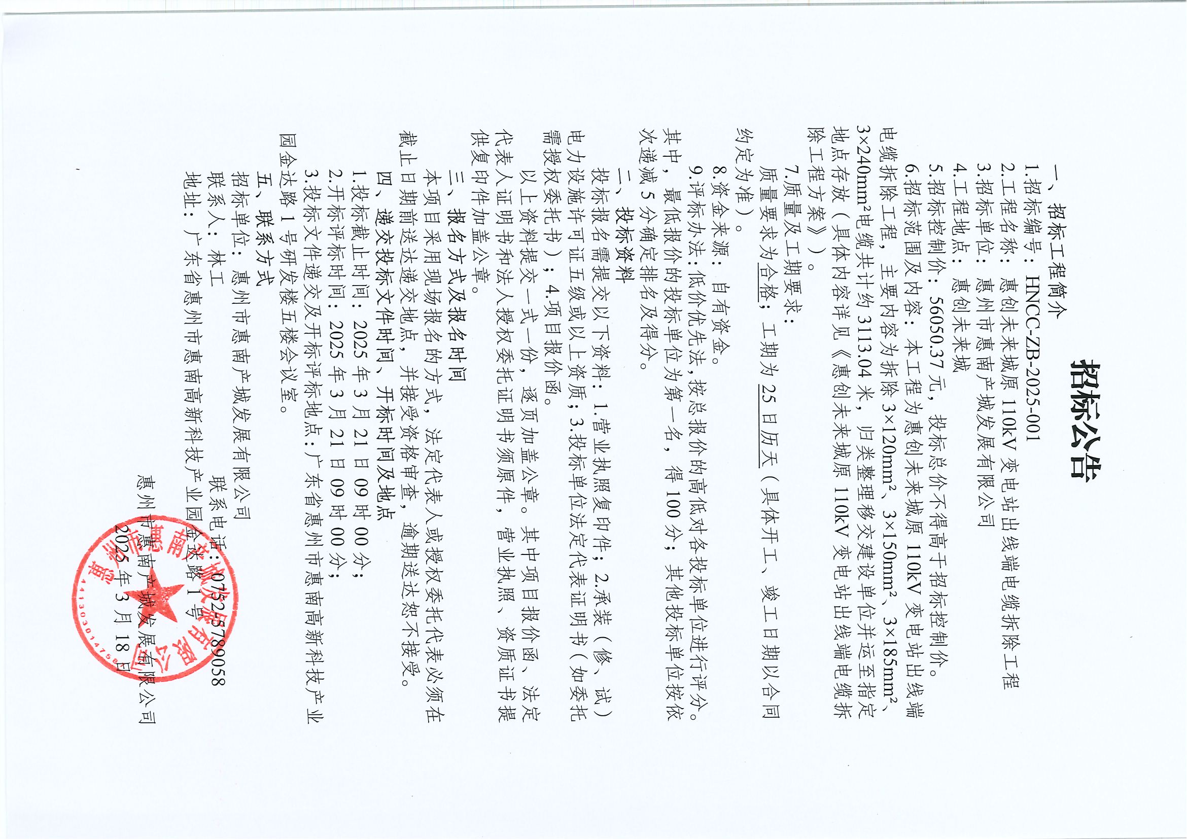 【招標公告】惠創(chuàng)未來城原110kV變電站出線端電纜拆除工程