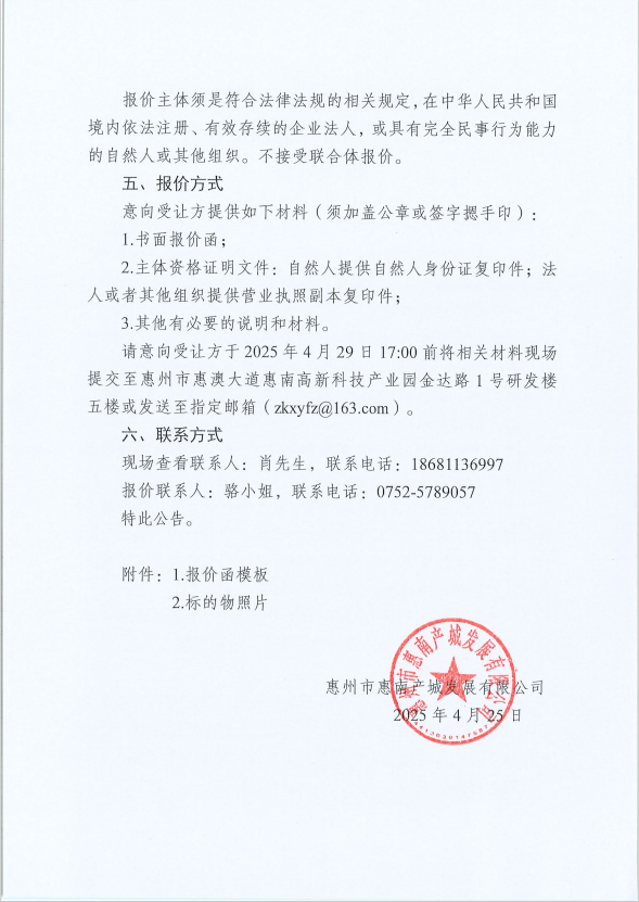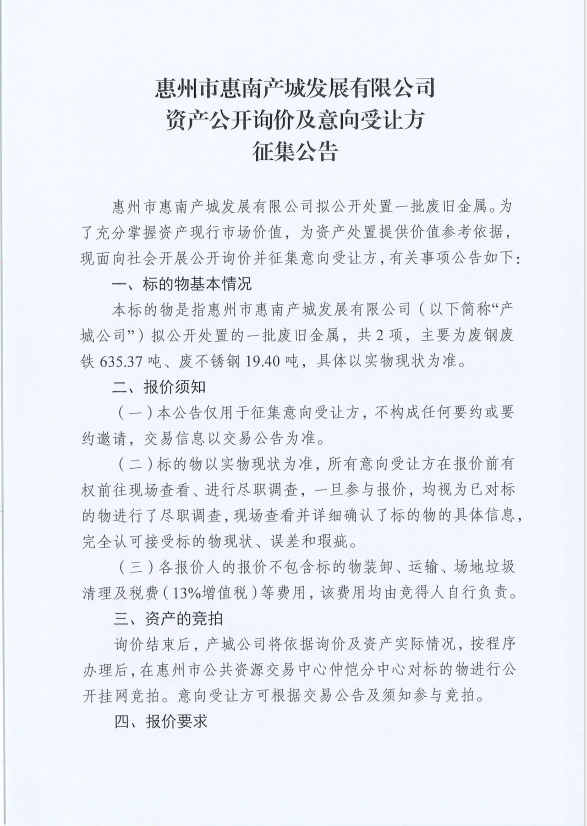 【招標(biāo)公告】惠州市惠南產(chǎn)城發(fā)展有限公司 資產(chǎn)公開(kāi)詢價(jià)及意向受讓方征集公告