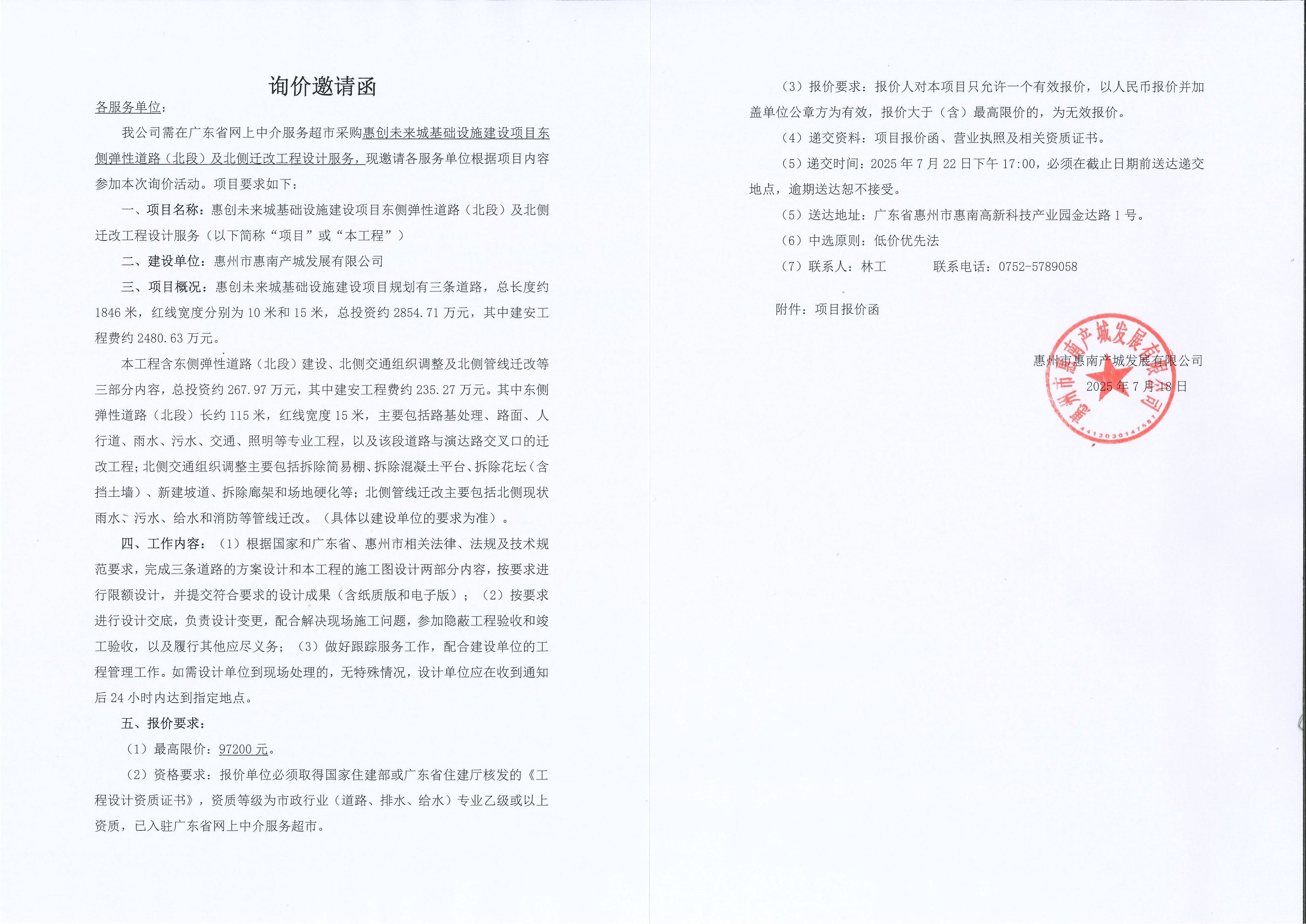 【詢價(jià)邀請函】惠創(chuàng)未來城基礎(chǔ)設(shè)施建設(shè)項(xiàng)目東側(cè)彈性道路(北段)及北側(cè)遷改工程設(shè)計(jì)服務(wù)