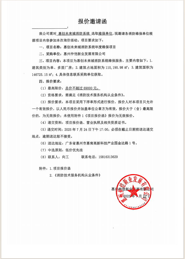【報價邀請函】惠創(chuàng)未來城消防系統(tǒng)維保服務(wù)