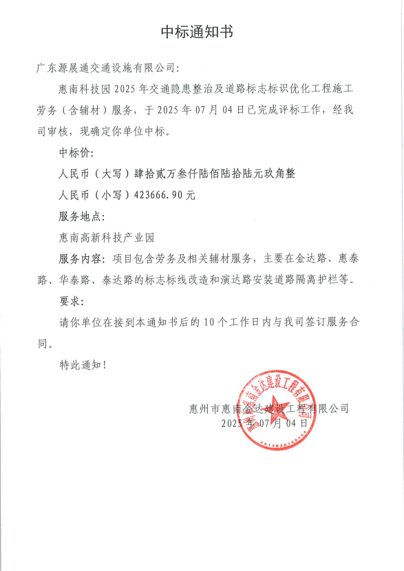 【中標(biāo)通知】惠南科技園2025年交通隱患整治及道路標(biāo)志標(biāo)識(shí)優(yōu)化工程施工勞務(wù)(含輔材)服務(wù)
