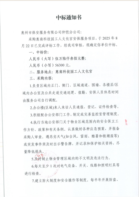 【中標(biāo)通知】采購惠南科技園工人文化宮安保服務(wù)項目
