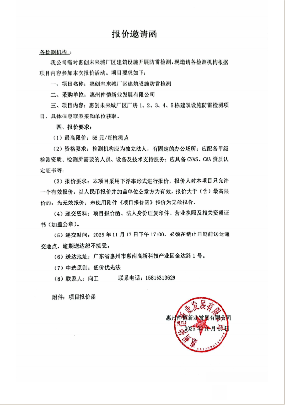 【報(bào)價(jià)邀請(qǐng)函】惠創(chuàng)未來城廠區(qū)廠房1、2、3、4、5棟建筑設(shè)施防雷檢測(cè)項(xiàng)目