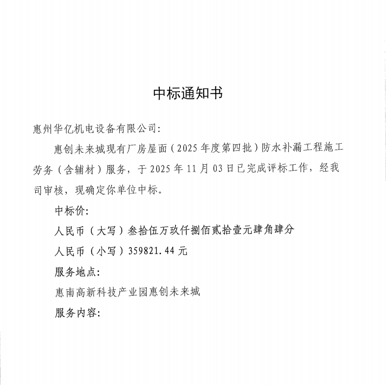 【中標(biāo)通知】惠創(chuàng)未來(lái)城現(xiàn)有廠房屋面(2025年度第四批)防水補(bǔ)漏工程施工勞務(wù)(含輔材)服務(wù)